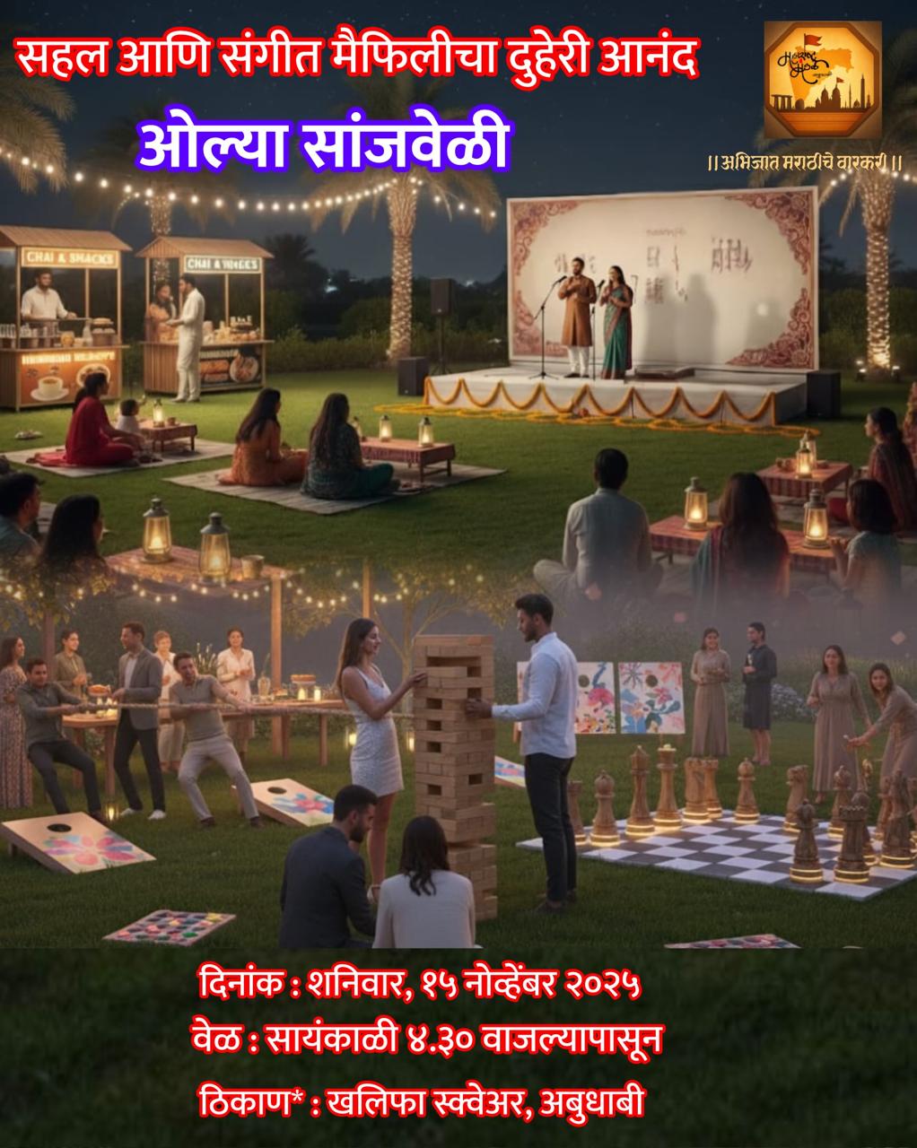 . सहल आणि संगीत मैफिलीचा दुहेरी आनंद:ओल्या सांजवेळी नमस्कार मंडळी, शनिवारी सुट्टीच्या दिवशी रम्य सायंकाळी खानपान, गप्पागोष्टी, मजेशीर खेळ आणि शांत सुंदर चांदण्याखाली हिरवळीवर बसून गाणी ऐकत आपल्या जीवनातील गोड आठवणींसोबत फेरफटका मारण्यासाठी तयार आहात ना!! महाराष्ट्र मंडळ अबुधाबी सादर करीत आहे एक बहारदार संगीत रजनी – ओल्या सांजवेळी दिनांक : शनिवार, १५ नोव्हेंबर २०२५ […]